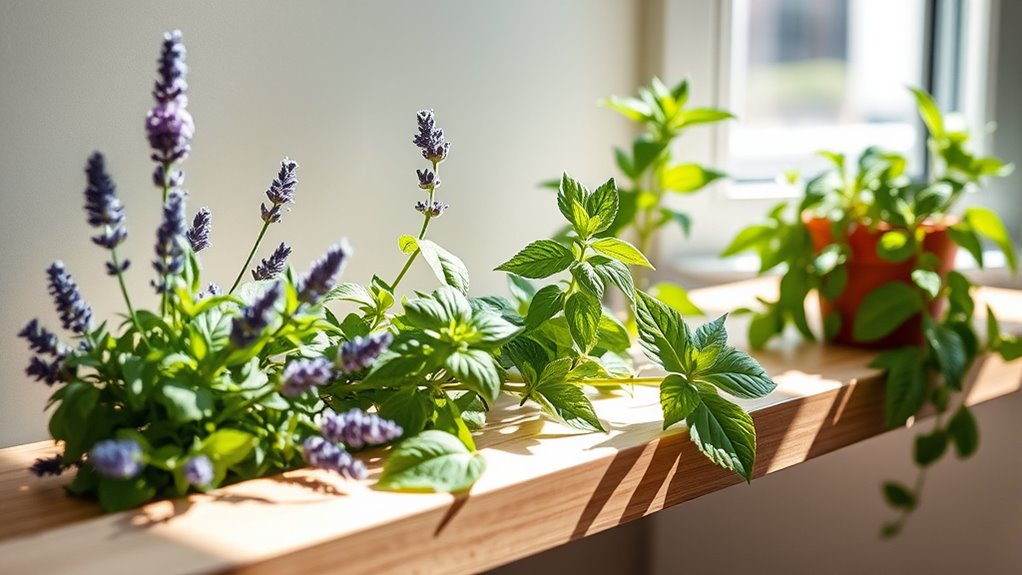 You might wonder if aromatic indoor plants need special watering or fertilizing. Generally, their watering needs are similar to other houseplants; keep the soil moist but not soggy. For fertilizing tips, use a balanced, water-soluble fertilizer every few weeks during growing season. Avoid overwatering or over-fertilizing, as this can harm the plant. Regular care guarantees your aromatic plants stay healthy and fragrant, enhancing your indoor environment naturally.
