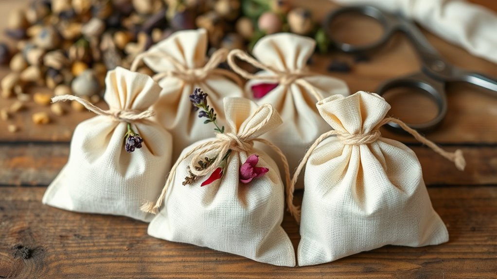 Once you’ve chosen your herbs, gather your materials. Small fabric pouches, such as muslin or linen, work perfectly. You can sew your own or buy pre-made sachets at craft stores. Fill each pouch with your chosen herbal mixture, but don’t overstuff; leave some room for the herbs to move and release scent. If you prefer, you can also fill small fabric bags with dried herbs and tie them shut with a ribbon or string. This method makes it easy to swap out herbs or add new ones over time. Additionally, herbal preservation techniques can help prolong the potency of your sachets.