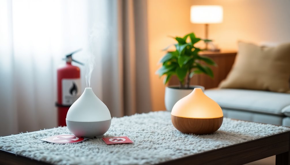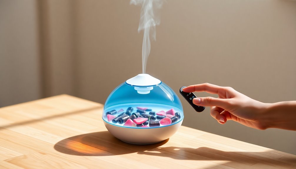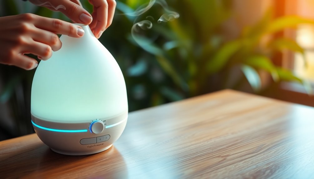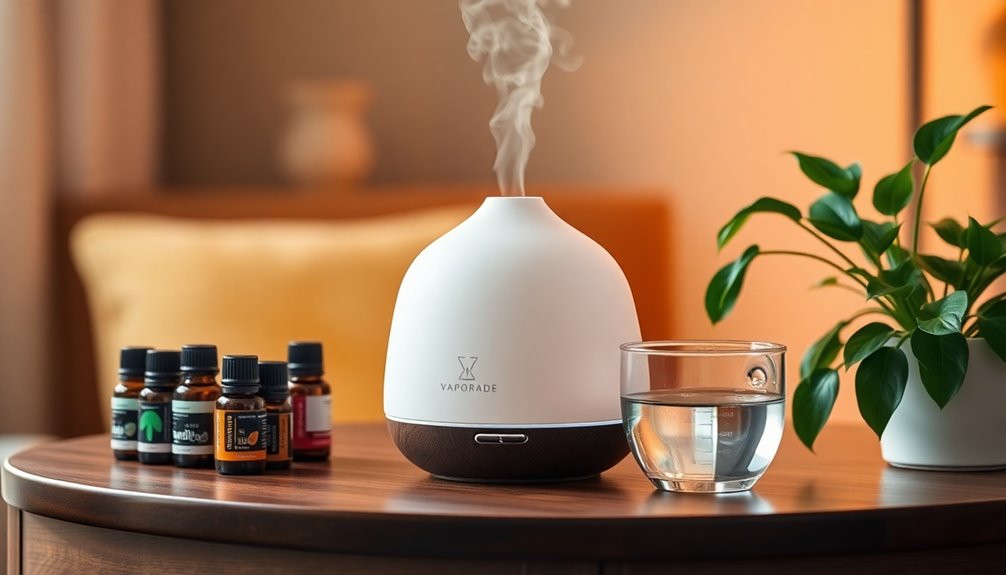To use your Vaporade Aromatherapy Technologies diffuser, first place it on a stable surface, ensuring it's at least two feet off the ground. Unplug it, then fill the water tank with distilled water up to the max line and add 5-10 drops of your favorite essential oils. Plug it in, turn it on, and adjust the mist output to suit your preference. Keep an eye on the water level and turn it off when empty. Regularly clean the tank with mild soap to maintain performance. Stick around to discover more tips for optimizing your aromatherapy experience!