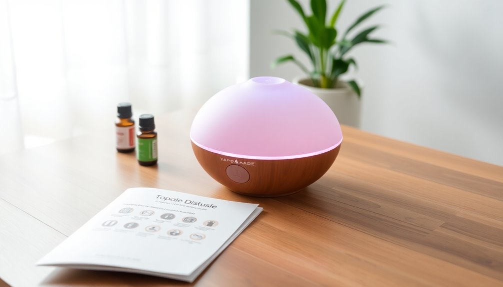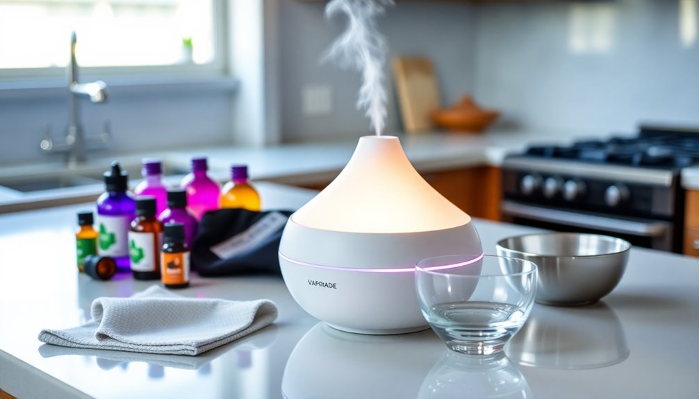 To prepare your Vaporade diffuser, start by gathering all necessary supplies, including distilled water and your favorite essential oils. Regularly using essential oils can help create a calming environment that enhances relaxation. Certain oils, such as eucalyptus oil, are particularly effective for respiratory health, as they can help clear nasal passages. Once you've selected your oils, fill the water tank up to the maximum fill line for peak performance. Essential oils can enhance the effectiveness of traditional cleaning agents when used in a diffuser, adding a pleasant aroma to your space. With everything ready, you can now assemble the diffuser and get it set up for use.