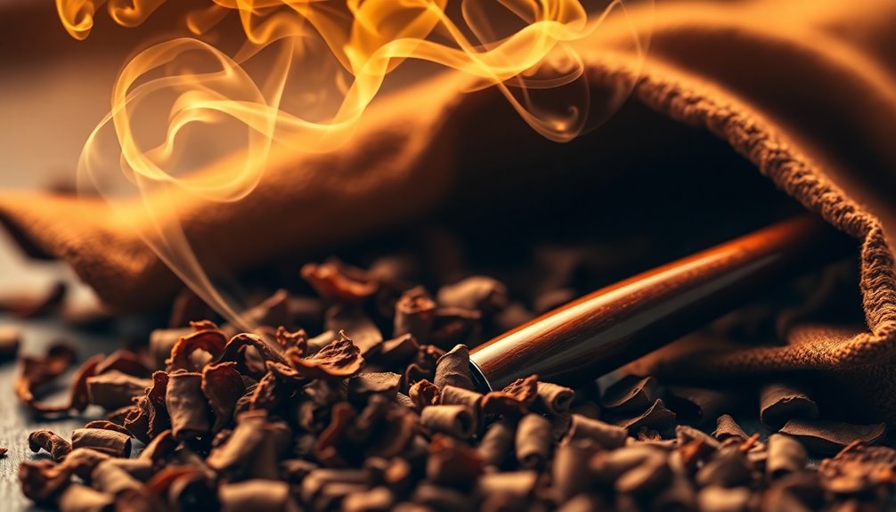 These skilled artisans carefully balance flavors and aromas, ensuring each blend enhances your smoking experience. In creating aromatic blends, specific additives are used, like vanilla or fruit essences, applied sparingly to maintain the natural tobacco taste.