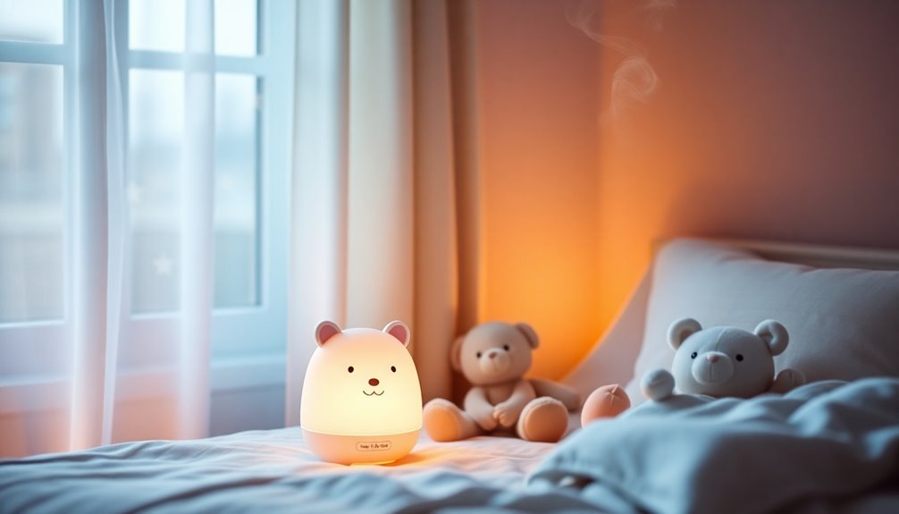 Safety is another priority, so I always look for diffusers with an automatic shut-off feature when the water runs out. This guarantees peace of mind while my little one sleeps soundly. In short, I make certain to evaluate capacity and runtime to find the perfect night-light aroma diffuser for a calming sleep environment.