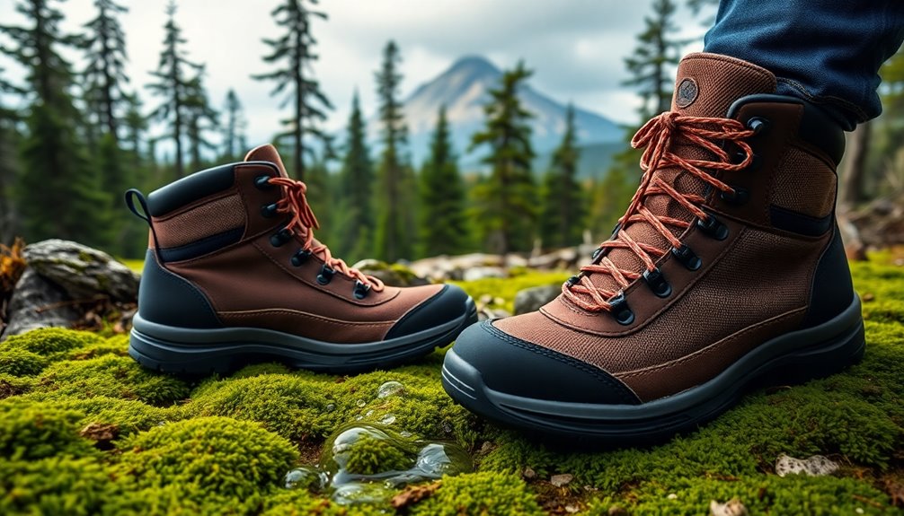 Finally, regular maintenance can't be overlooked. By applying waterproof treatments and cleaning them after muddy adventures, I can prolong their lifespan and maintain their waterproof capabilities. Investing time in these factors guarantees that my hiking boots will withstand the elements and keep my feet dry and comfortable on every journey.